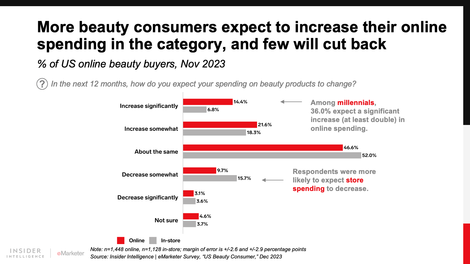 Millennials report the highest amount of online beauty spending, with nearly a quarter (24.4%) of the generation spending $1,000 or more in the last year, per our The US Beauty Consumer report. More than a third (36.0%) of millennials expect a significant increase (at least double their current spend) in online beauty spending over the next year.
