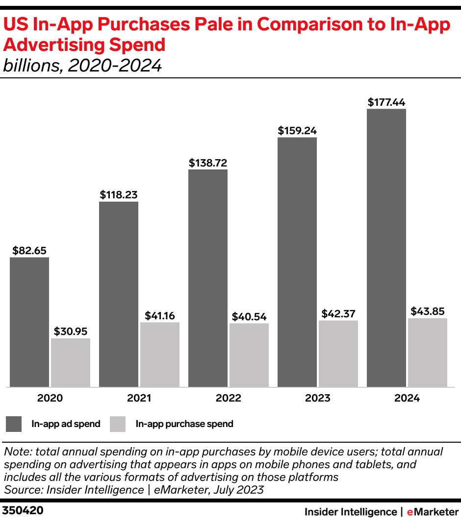 Key stat: US mobile in-app ad spend will be about four times higher than in-app purchase spend this year, at $159.24 billion compared with $42.37 billion, according to our forecast.