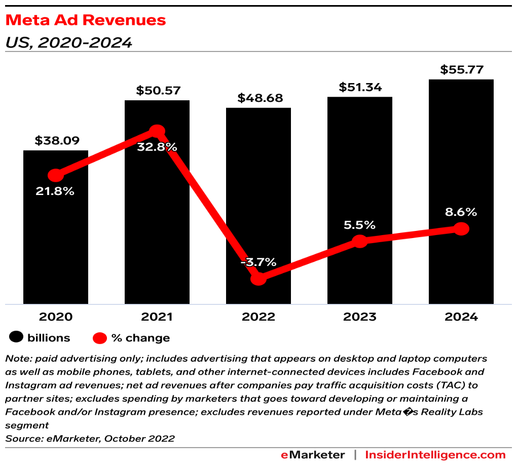 Analyst insight: “To return to stronger growth, Meta needs to turn its business around,” said principal analyst Debra Aho Williamson. “As Facebook Inc., it was a revolutionary company that changed the way people communicate and the way marketers interact with consumers. Today, it’s no longer that innovative groundbreaker.”
