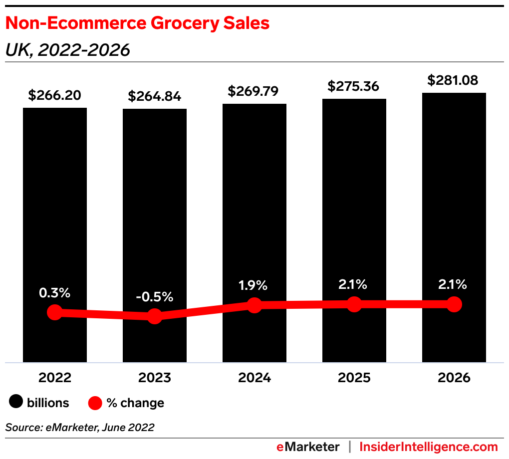 A tough environment: The UK grocery market is fiercely competitive with flat growth. We expect non-ecommerce grocery sales to grow just 0.3% this year.