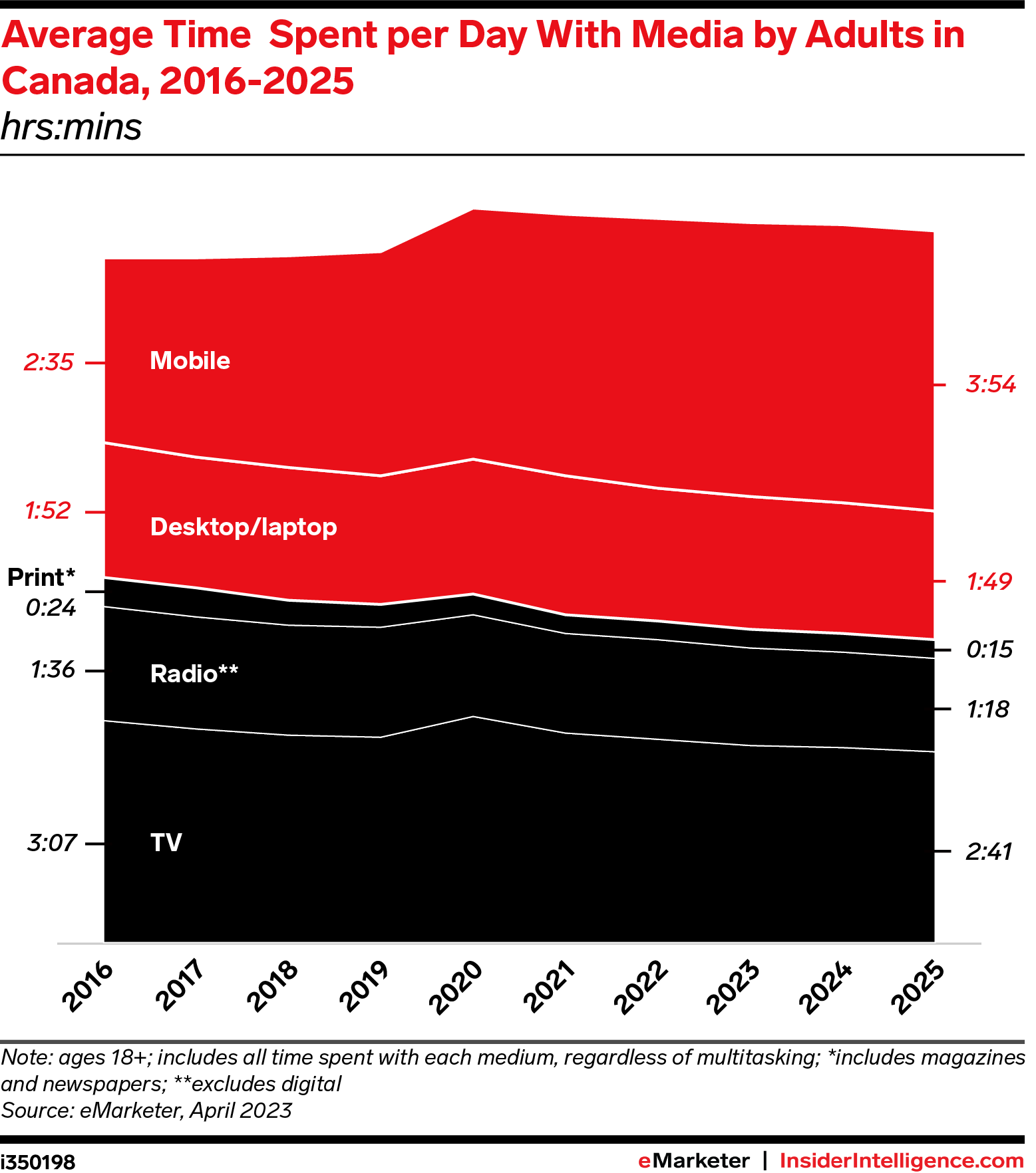 Our annual forecast of media consumption in Canada reveals time spent on media in the country is among the highest in countries we track. Average time is now well over 11 hours daily, second only to the US figure of 12:11.