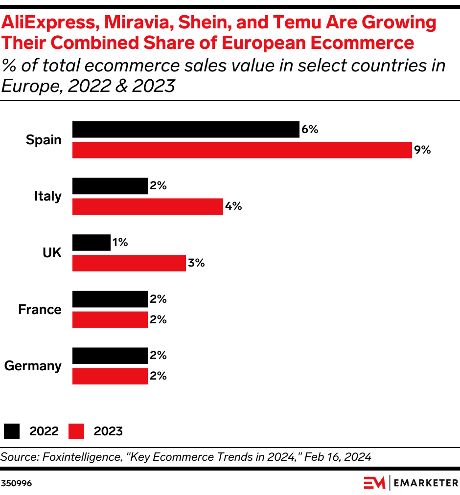 Key Stat: Shein, Temu, and Alibaba-owned AliExpress and Miravia had a combined 9% share of Spain’s ecommerce sales value in 2023—up from 6% in 2022.