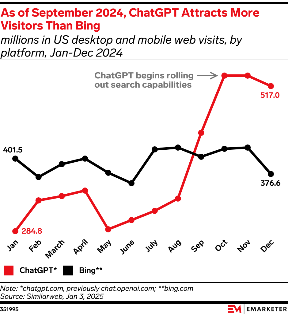 By share of US queries, Microsoft’s Bing search engine has long been a distant second to Google. But data from digital market intelligence company Similarweb suggests that ChatGPT is hot on Bing’s heels. In September 2024, ChatGPT attracted more web visits than Bing for the first time since its November 2022 launch. ChatGPT began rolling out search capabilities in October 2024 and has held onto that lead ever since.