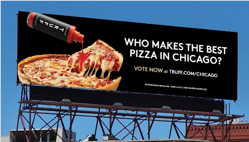 For local OOH ads, contextual relevance is key. TRUFF hot sauce took advantage of location with interactive OOH ads in Philadelphia featuring Philly cheesesteaks and in Chicago featuring deep-dish pizza. These ads lean into local food culture while encouraging social media interaction by encouraging consumers to vote for their favorite dish. “The goal of their out-of-home was to live a life on social,” said Rappaport.