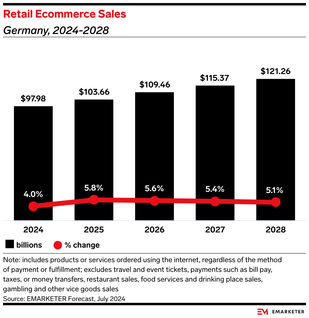 The news: Ecommerce sales in Germany rose 1.1% YoY last year to €80.6 billion ($87.2 billion), the first growth since 2021, per trade group BEVH.