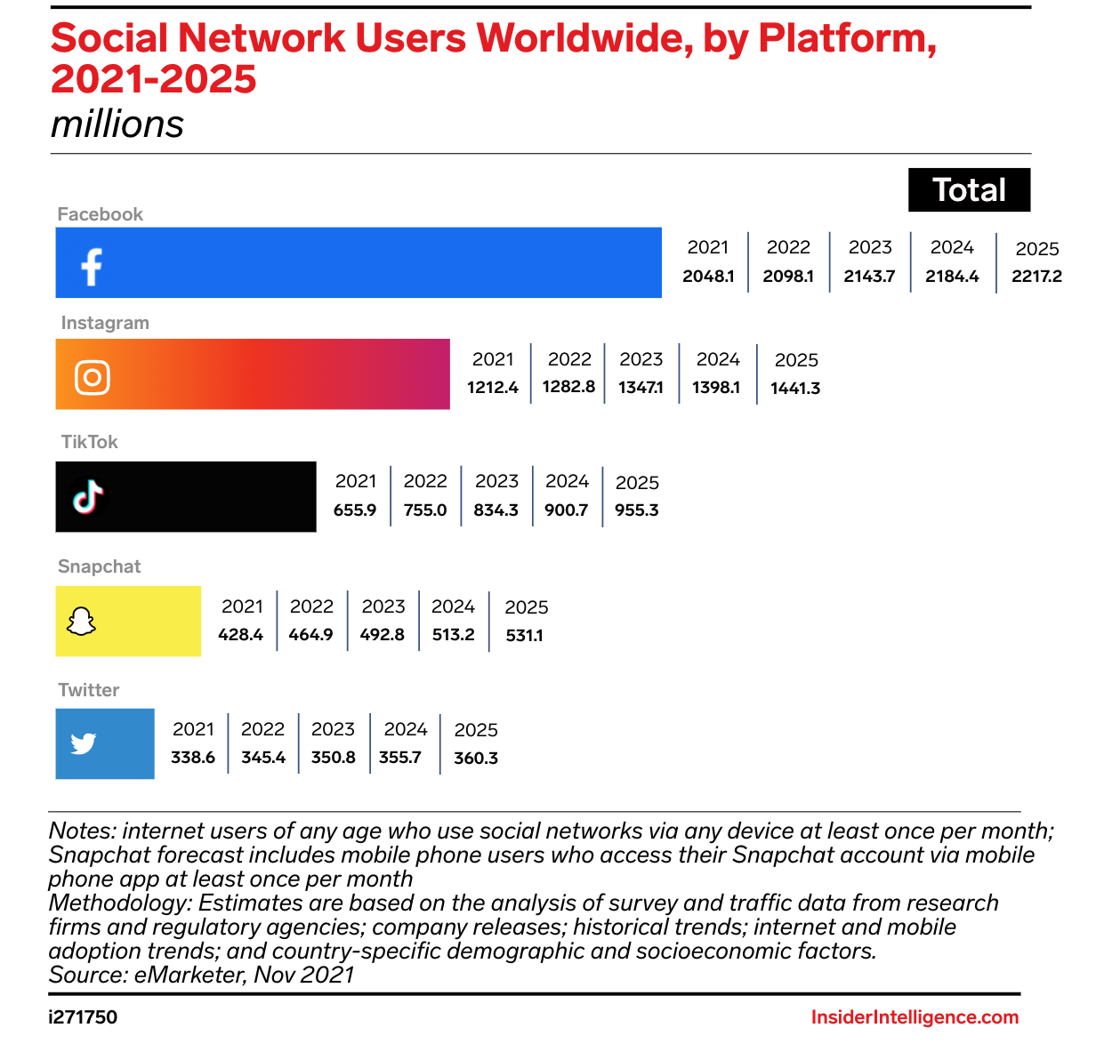 KEY STAT: Facebook is the leading social network by far, but our inaugural forecast reveals that TikTok is now the third-largest worldwide platform.