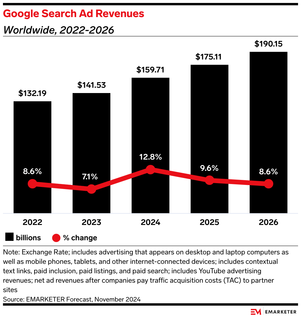 • Google is expected to maintain over 72% of all US search ad spending by 2026, increasing from 71.7% in 2025, while Microsoft holds just 7.7%.
