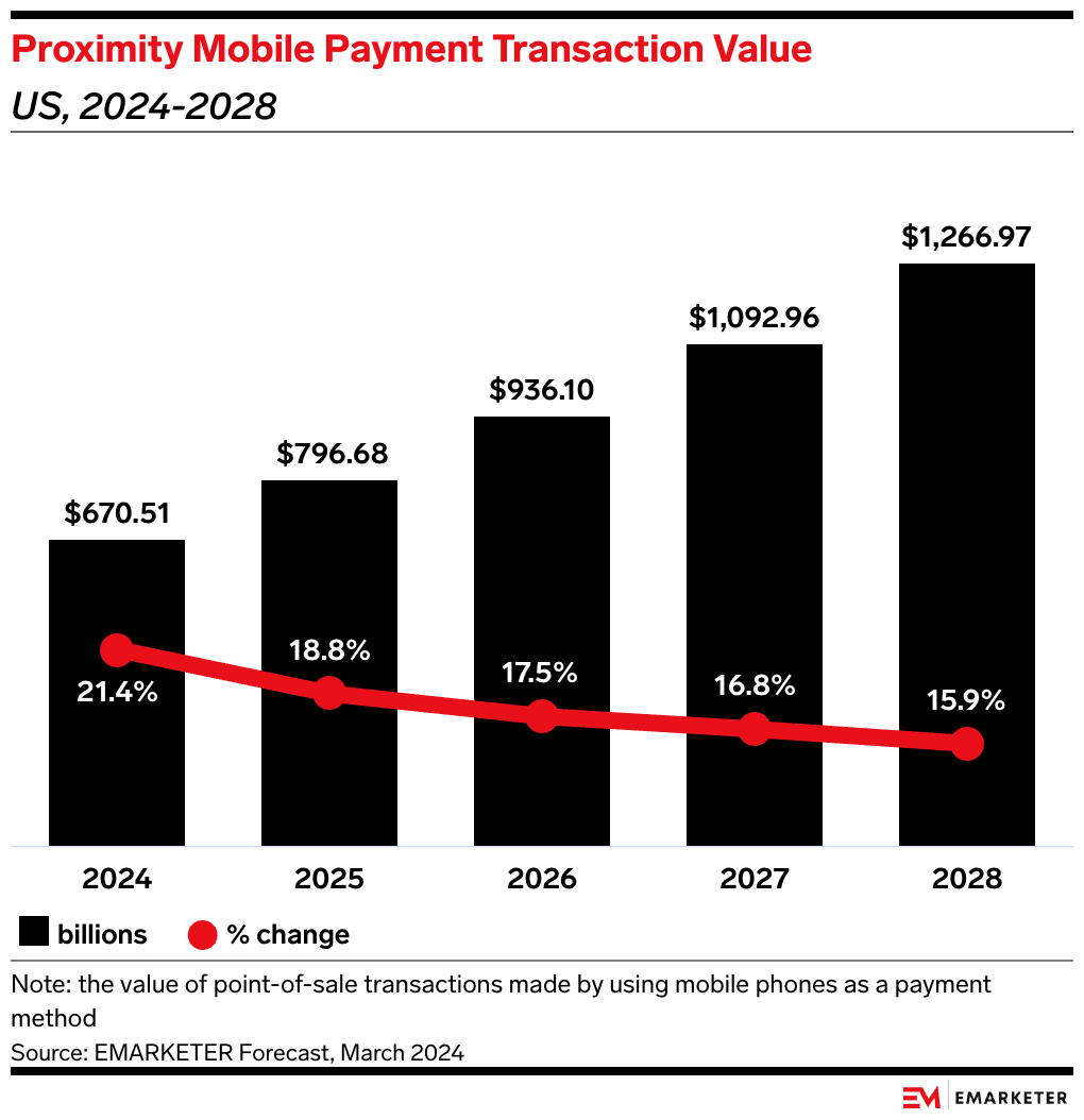 • Proximity mobile payment transaction value will nearly double from 2024 to 2028. And smartphone user penetration will rise from 39.3% to 45.4% in that period, per our forecast. Thanks to growing acceptance, user experience improvements, and commerce feature enhancements, spend per user will also rise.