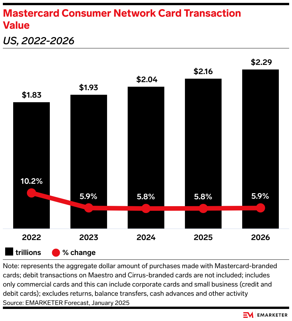 We forecast Mastercard's US consumer card network transaction value will total $2.16 trillion in 2025, up 5.8% YoY.