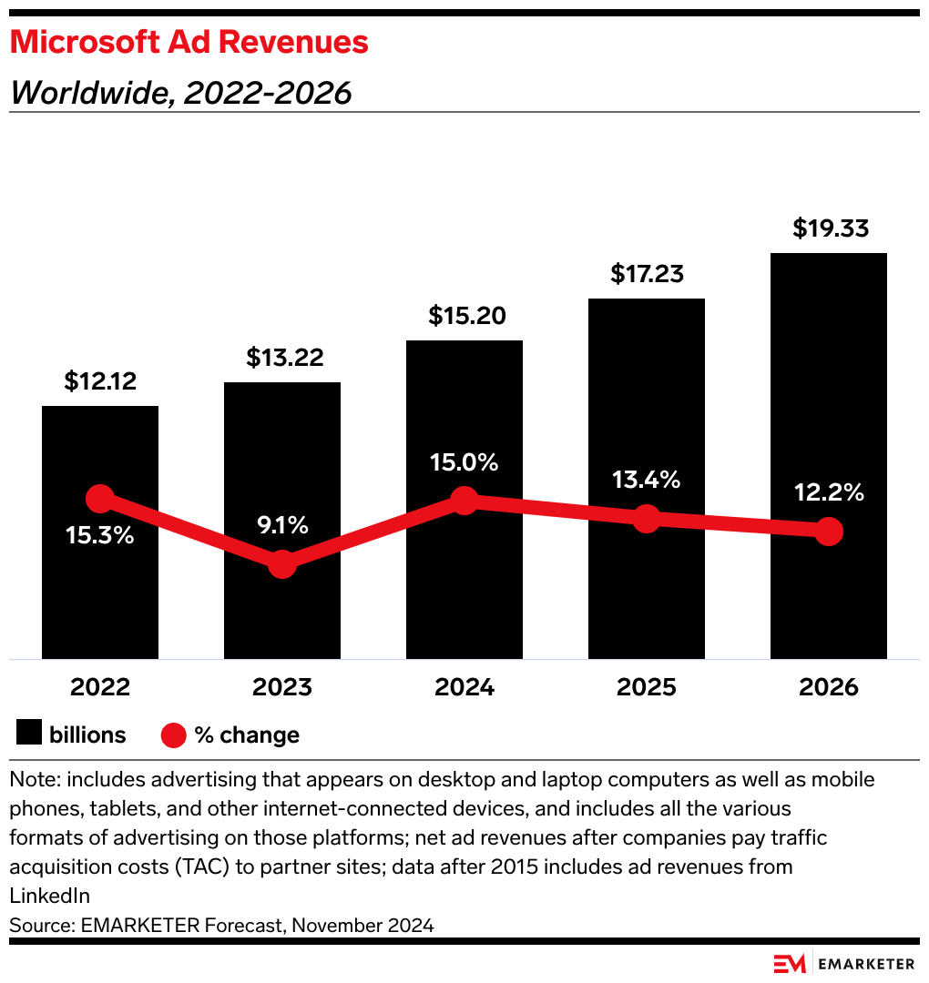 • For now, advertising remains an underwhelming piece of the puzzle. While Microsoft’s ad business is growing, it still lags behind Google and Meta in market influence.