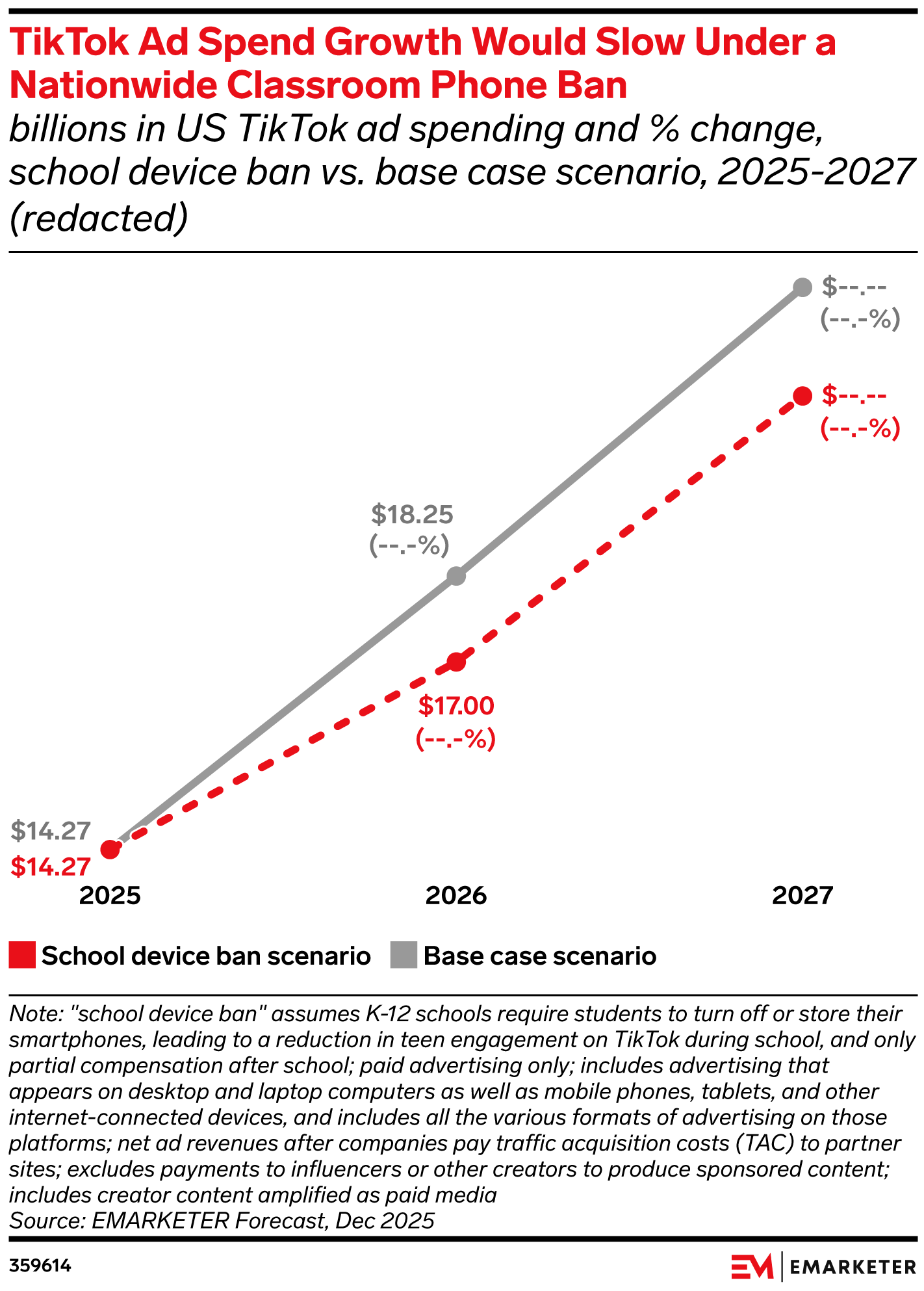 Key Stat: A nationwide classroom ban of mobile phones in the US would cause TikTok to lose out on $1.25 billion in ad revenues this year, per our analysis, since it would limit advertisers’ ability to reach kids and teenagers.