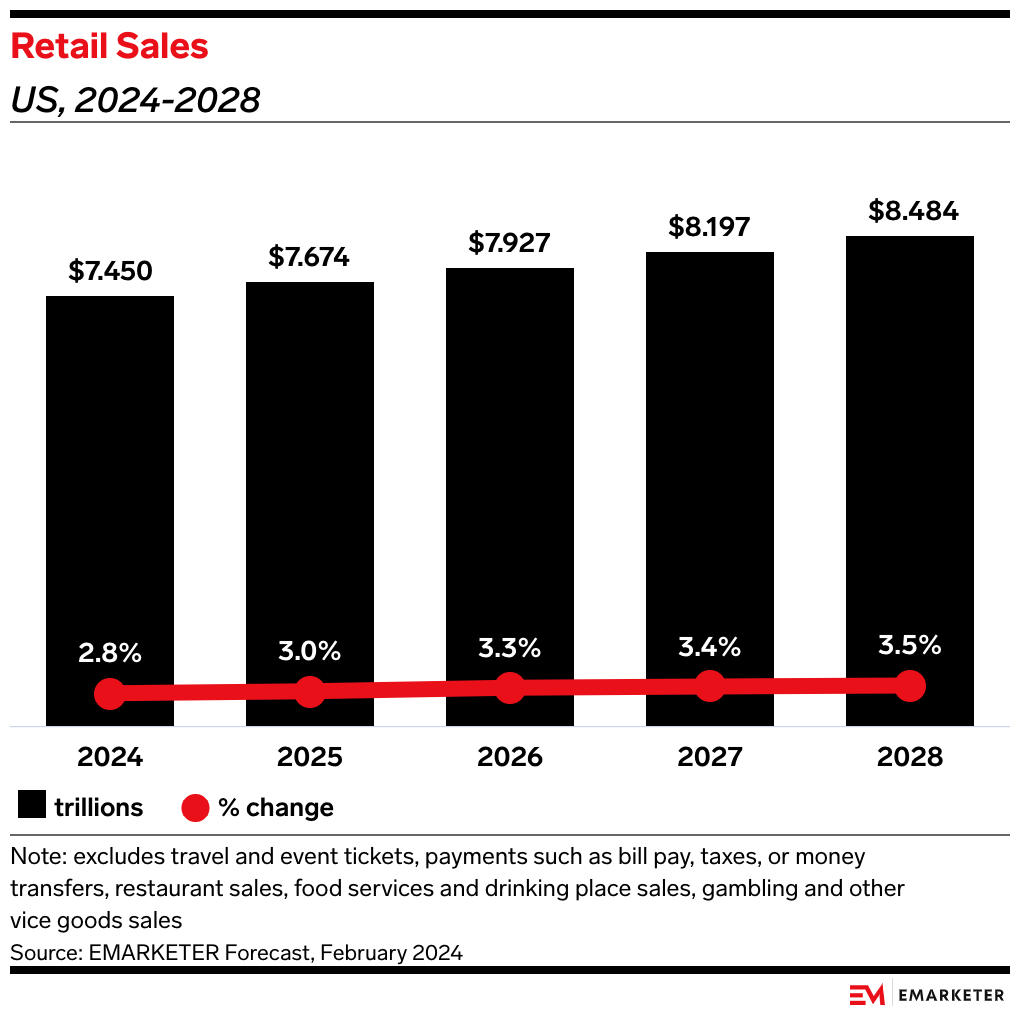 The conditions suggest a relatively healthy landscape for retail, which is in line with our expectations of US retail sales growth of 2.8% this year, up from 2.1% last year.