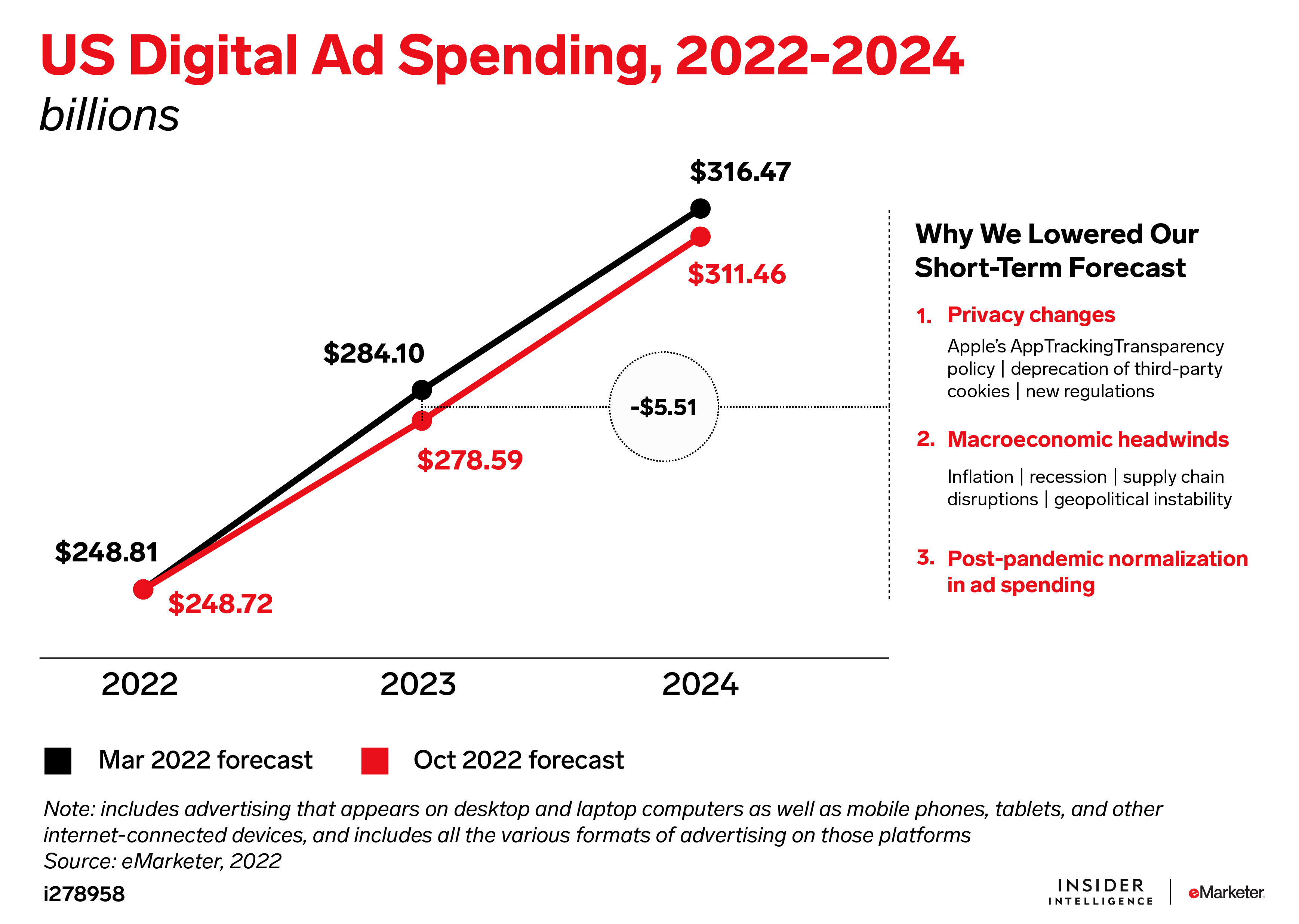 • Social platforms continue to be hurt by Apple’s 2021 privacy changes as macroeconomic uncertainty inhibits most ad spending growth. We cut our forecast for US social media ad spending this year by $16.21 billion to $71.05 billion, with the majority of that downward revision due to Meta.