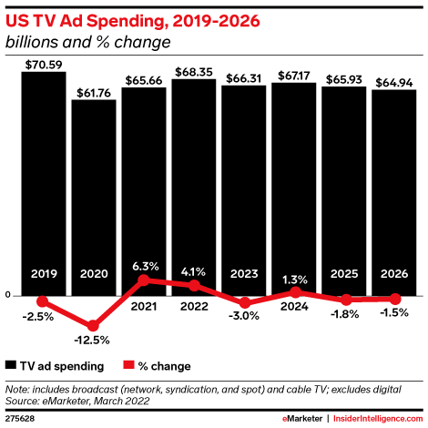 KEY STAT: US TV ad spending will grow to $68.35 billion in 2022 but will trail downward over the coming years, except for a slight bump in 2024 due to the presidential election and Summer Olympics.