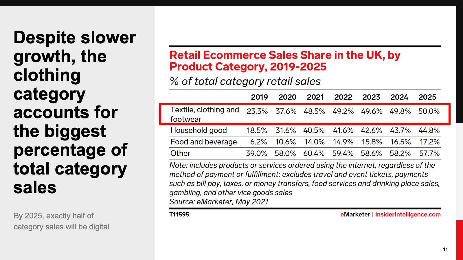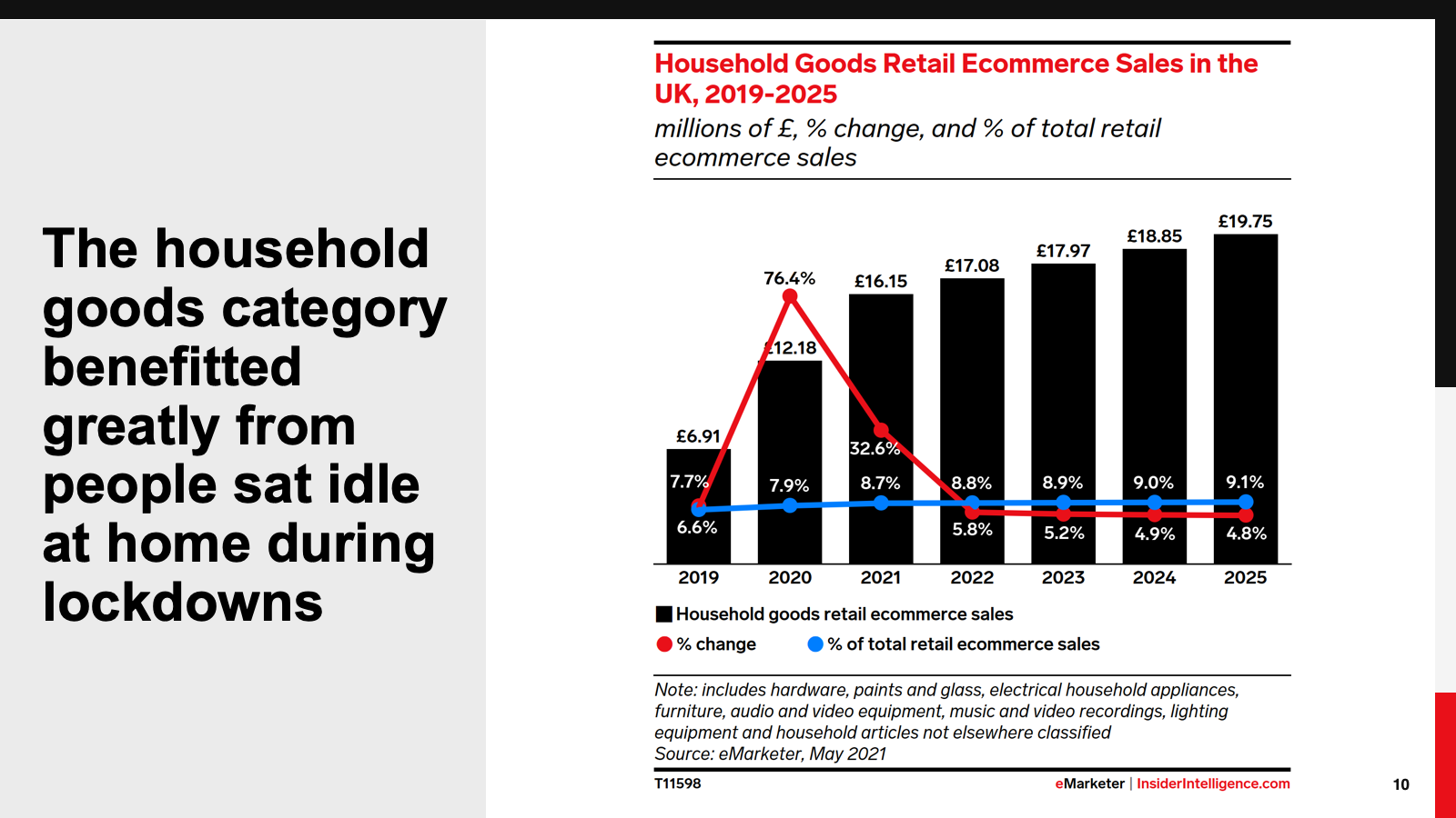 Online, the food and beverage and household goods categories benefited from UK lockdowns. Older age groups adapted to online grocery shopping, boosting the food and beverage category. Household goods, meanwhile, benefited from people stuck at home seeking to improve their lockdown experience. The textiles, clothing, and footwear category suffered badly, even though ecommerce sales remained strong. By 2025, we expect ecommerce sales to account for half of all sales in this category.