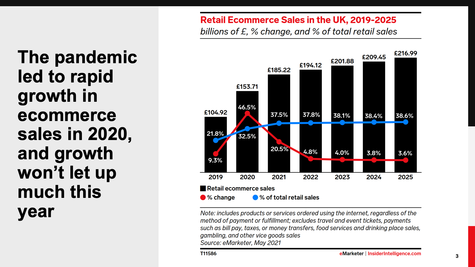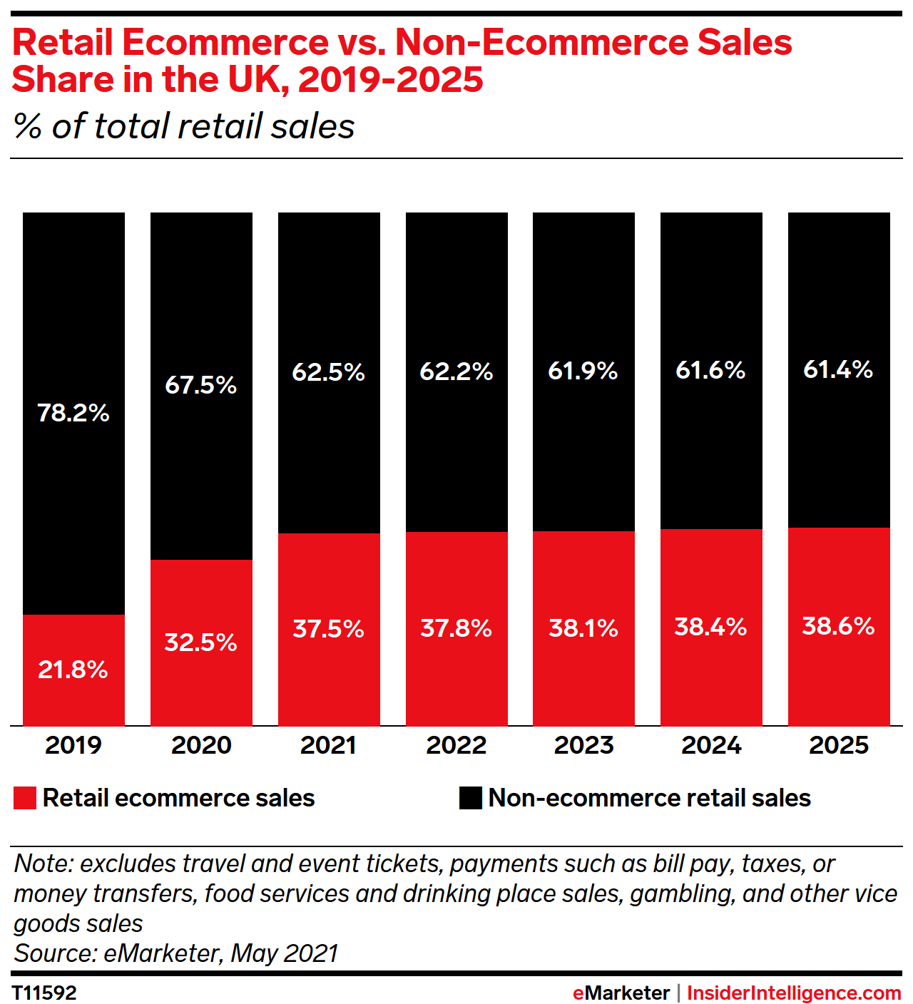 KEY STAT: Physical retail has historically dominated the total retail sales share in the UK, but the pandemic has brought the ecommerce portion much closer to parity. By 2025, ecommerce will account for 38.6% of total retail sales.