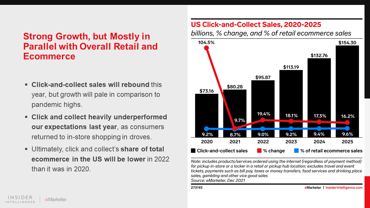 KEY STAT: US buyers will spend $95.87 billion via click and collect this year, a 19.4% increase year over year (YoY). However, the fulfillment option’s surprisingly sluggish 2021 means spending is well below what we anticipated.