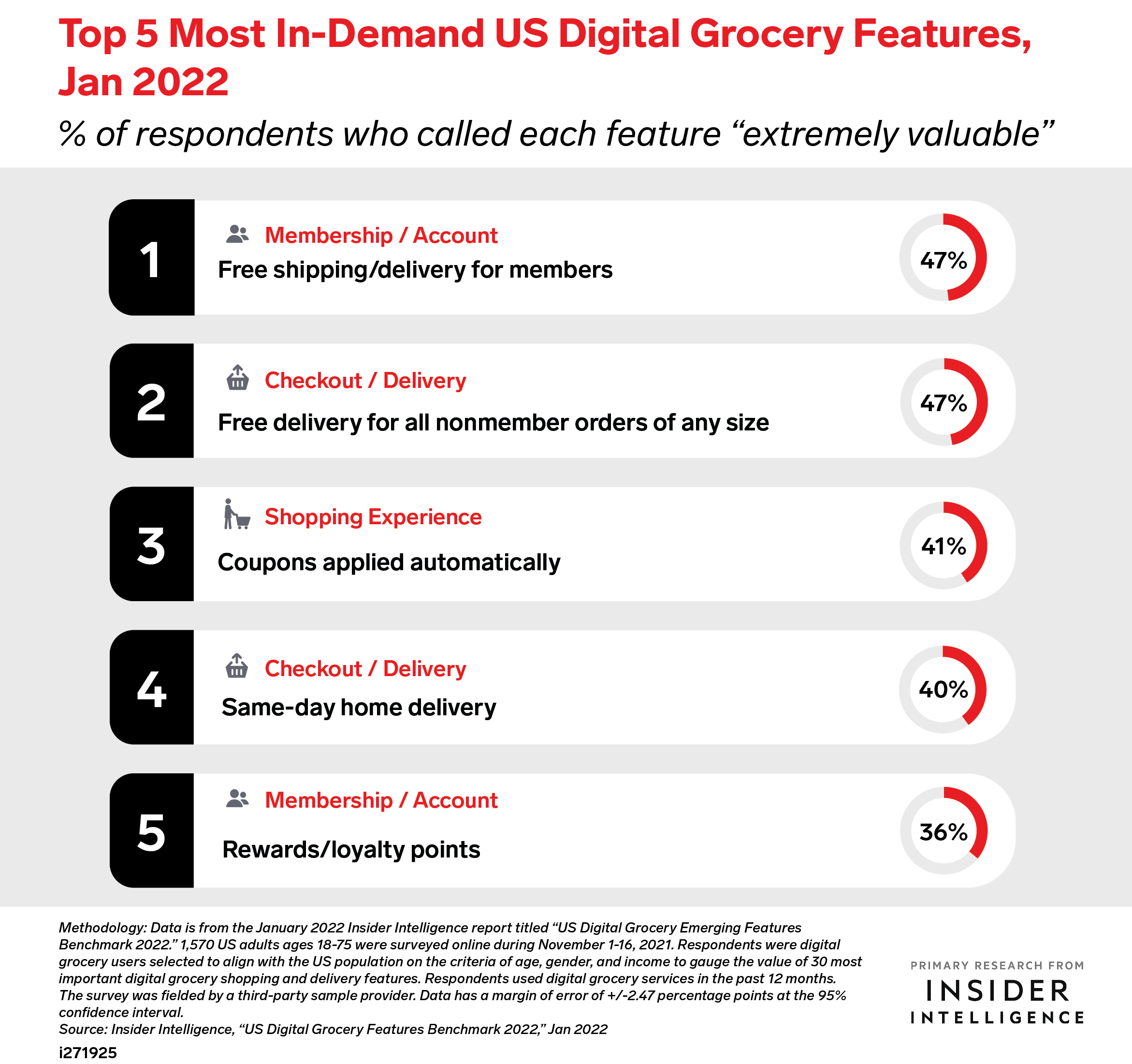 KEY STAT: The top five most in-demand features among digital grocery buyers revolved around delivery, savings, or a combination of both. Digital grocery buyers want the convenience of delivery but remain cost-conscious with grocery buying overall.