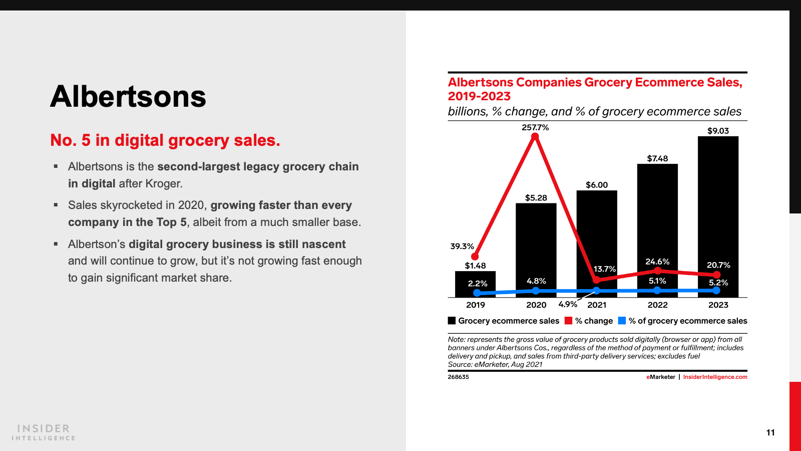 KEY STAT: US digital grocery sales grew 63.9% in 2020 and will grow another 12.3% this year, reaching $122.39 billion. Sales will nearly double by 2025, reaching $243.67 billion.