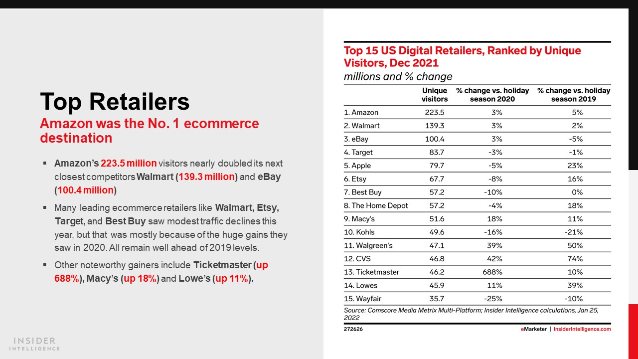 WHAT’S IN THIS REPORT? A review of the 2021 US holiday season and an early preview of the 2022 holidays, including our latest US retail and ecommerce spending forecast.