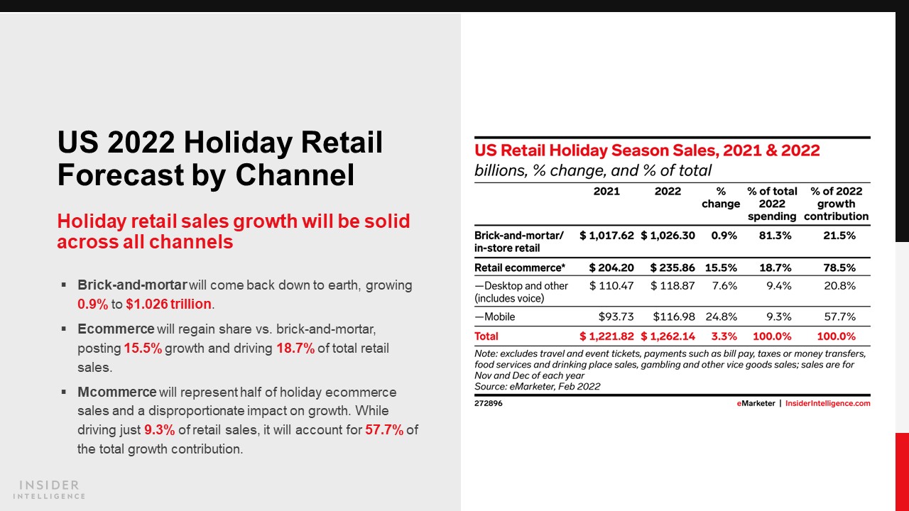 We expect 2022 holiday retail sales to increase 3.3% to $1.262 trillion, with brick-and-mortar increasing 0.9% to $1.026 trillion and ecommerce climbing 15.5% to $235.86 billion.