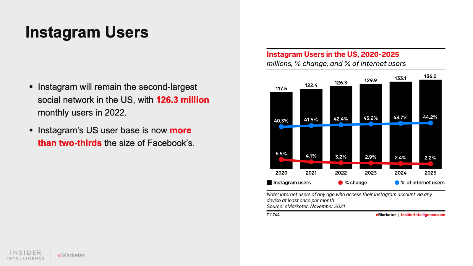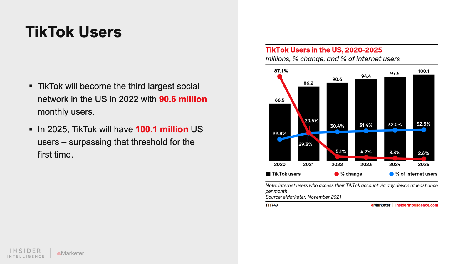 KEY STAT: TikTok will have 90.6 million monthly users in 2022, surpassing Snapchat users and Pinterest users but significantly behind Instagram and Facebook.