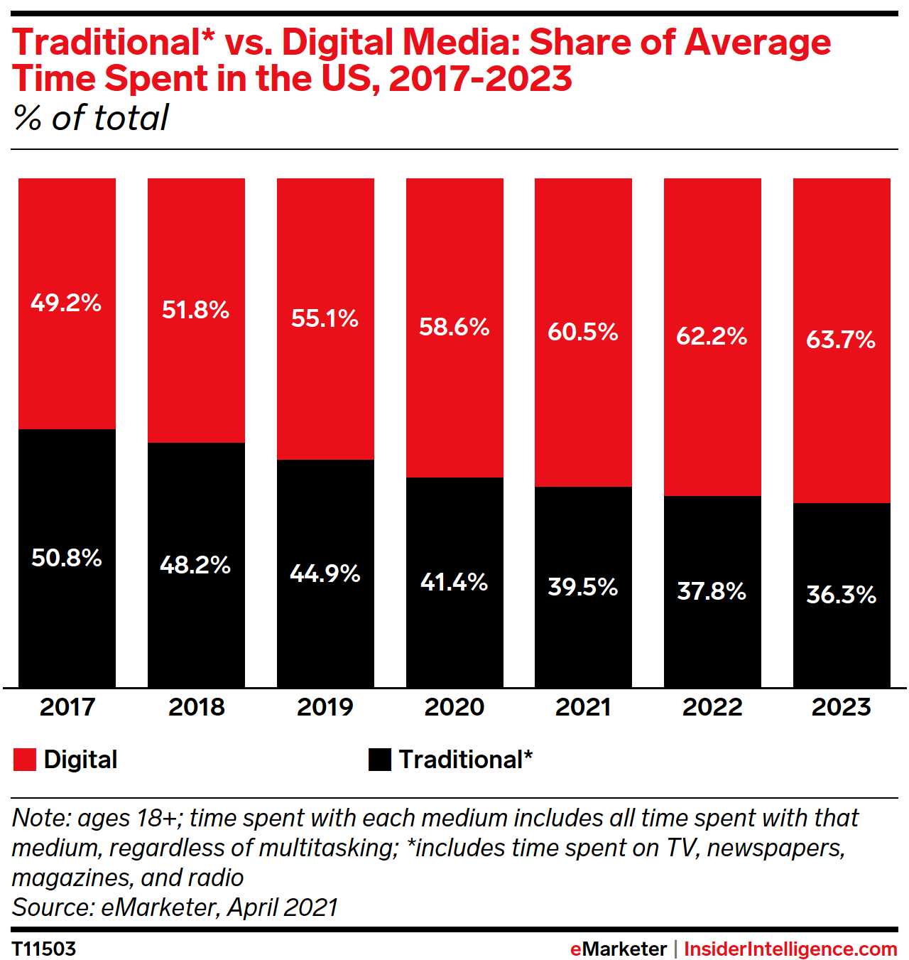 KEY STAT: US adults will spend 13:12 per day with media in 2021. Of this total, 60.5% will be spent with digital media in 2021—and that share will increase to 63.7% by 2023.