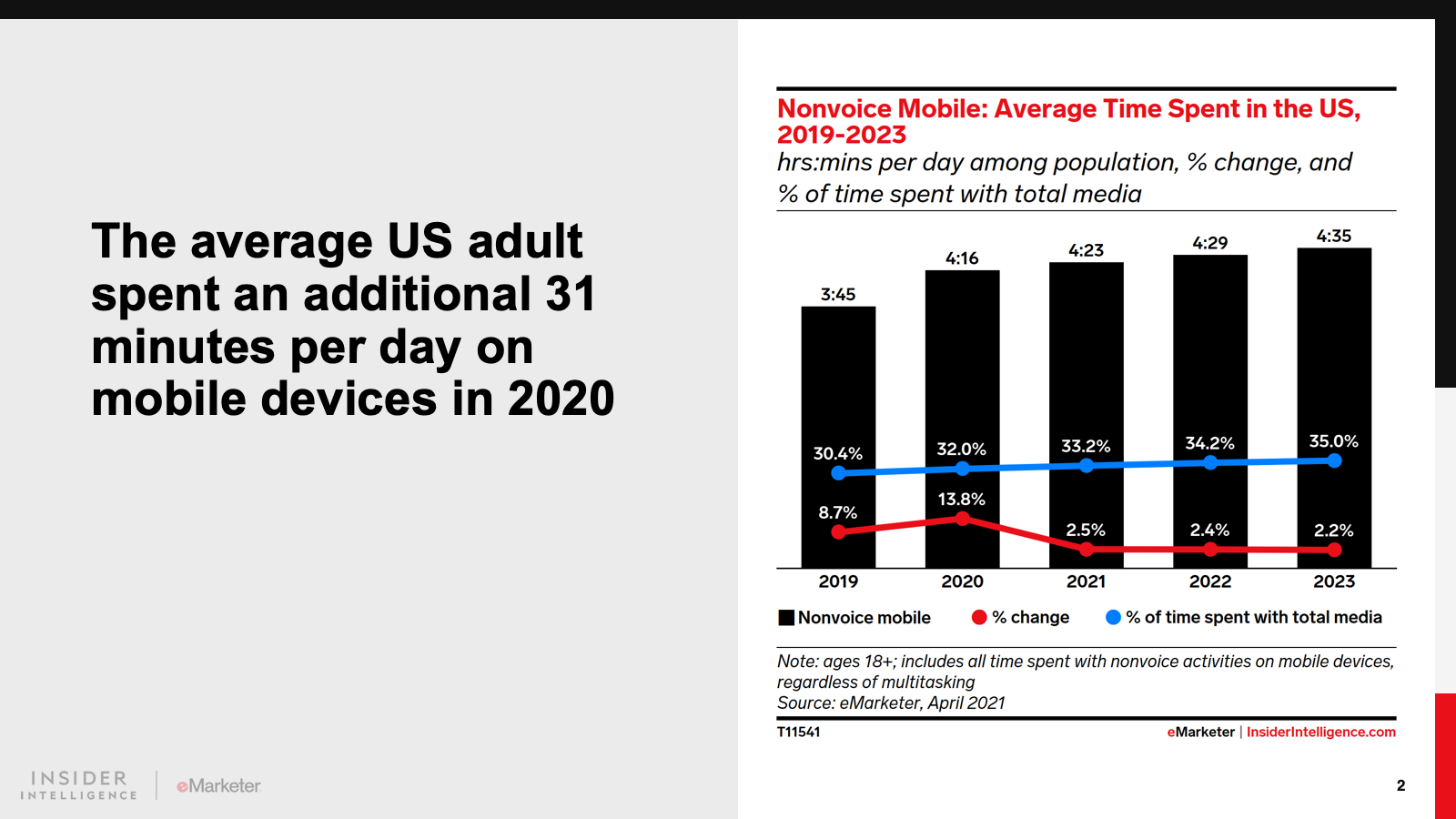 The pandemic accelerated the growth of time spent with mobile, in some cases by years. Time spent with mobile increased by an average of 31 minutes per US adult in 2020, reaching 4 hours and 16 minutes. Growth will only hit 2.5% in 2021, but that’s on top of a higher baseline.