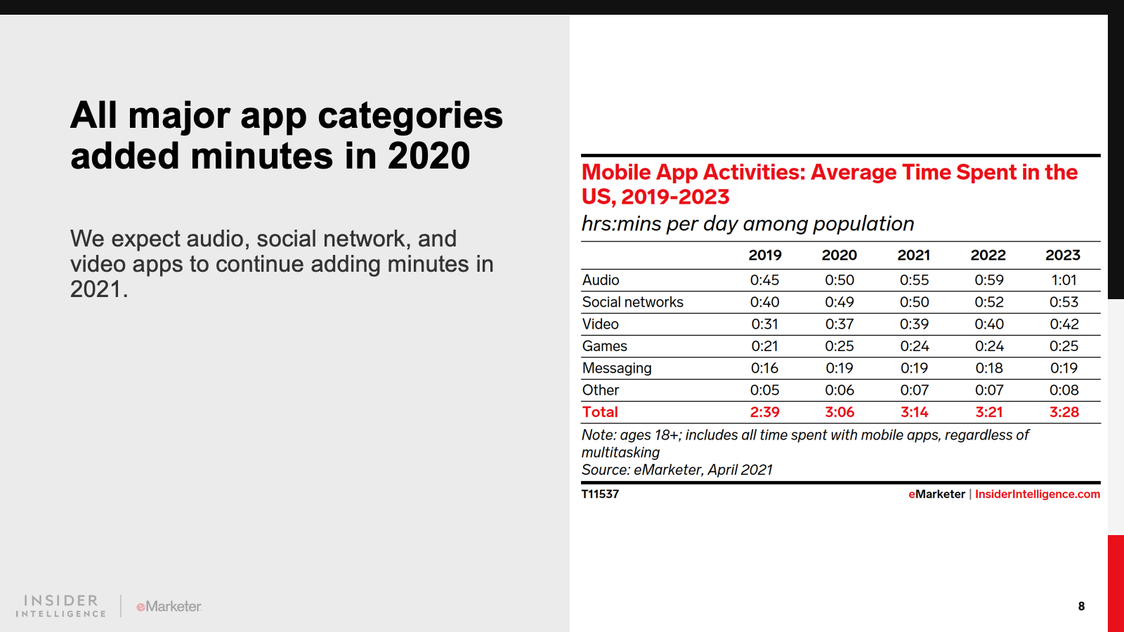 For the most part, the pandemic accelerated existing trends. The big exceptions were in travel-related apps, which saw a large decrease in time spent during the pandemic, and digital audio apps, which grew but without a noticeable spike in 2020. These apps will return to faster growth in 2021.