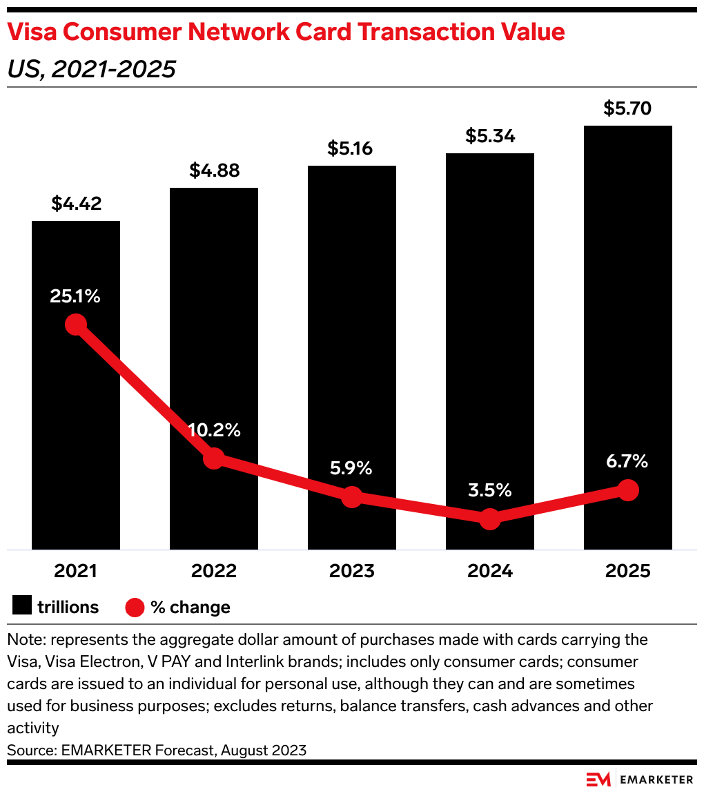 • Visa estimated that the global personal consumption expenditures in 2022, excluding Russia and China, was roughly $40 trillion. It says its addressable opportunity is more than $20 trillion of that spend.