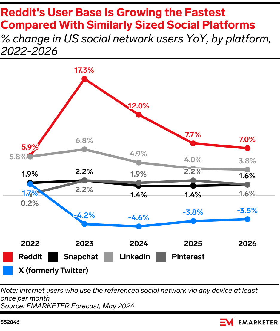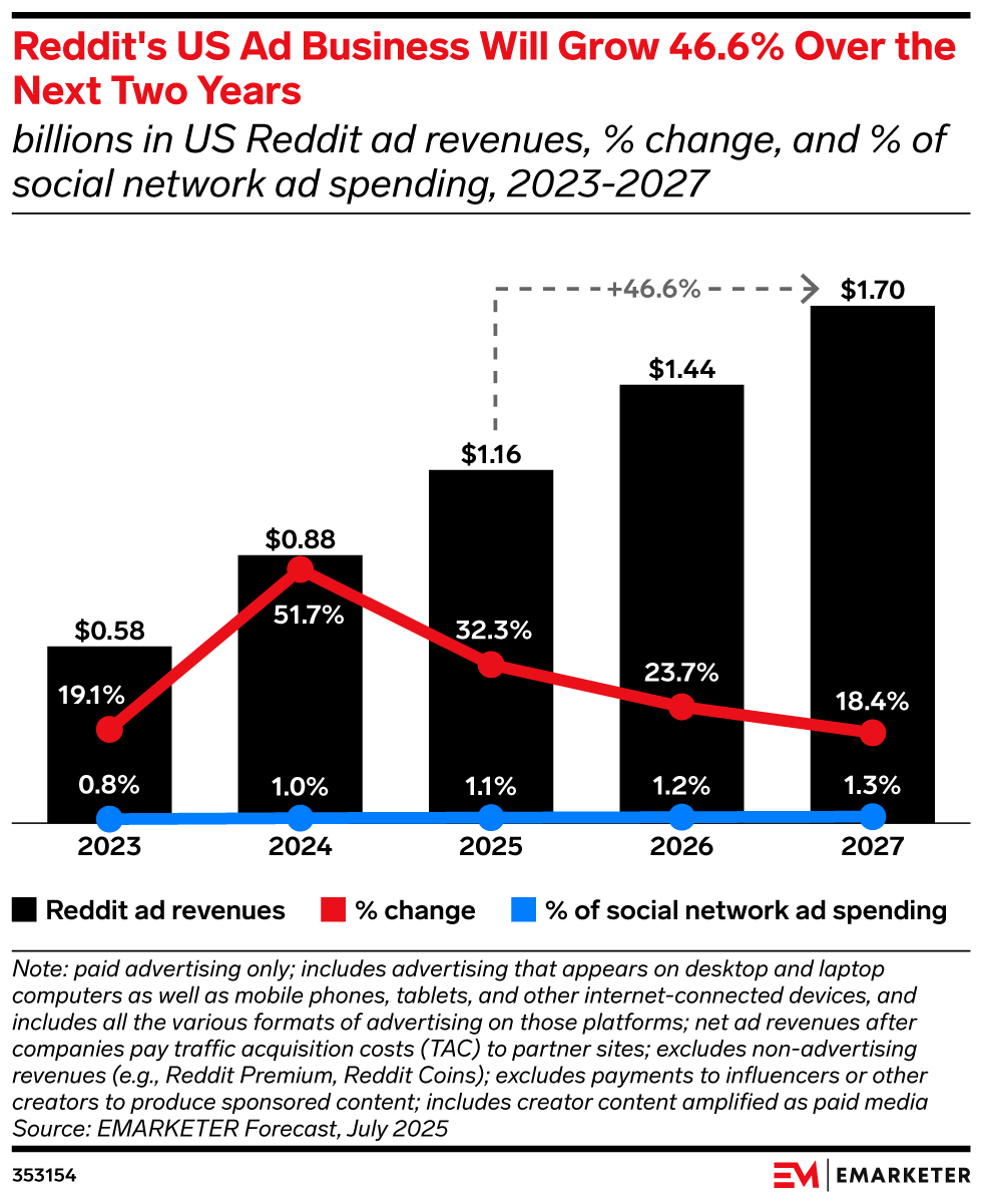 The news: Reddit’s ad business is on a path of steady growth, with ad revenues expected to reach $1.8 billion this year and grow 29% to reach $2.5 billion in 2026, per a new WARC forecast. Brand participation on Reddit shows promising results: One organic brand post per week increases positive mentions by 3.5%. Our take: Though Reddit’s massive growth is partially attributed to its smaller reach, its ability to reach users that aren’t frequenting more popular platforms warrants investment, and a diversified approach combining Reddit’s unique community-driven base with larger platforms’ massive reach is key.