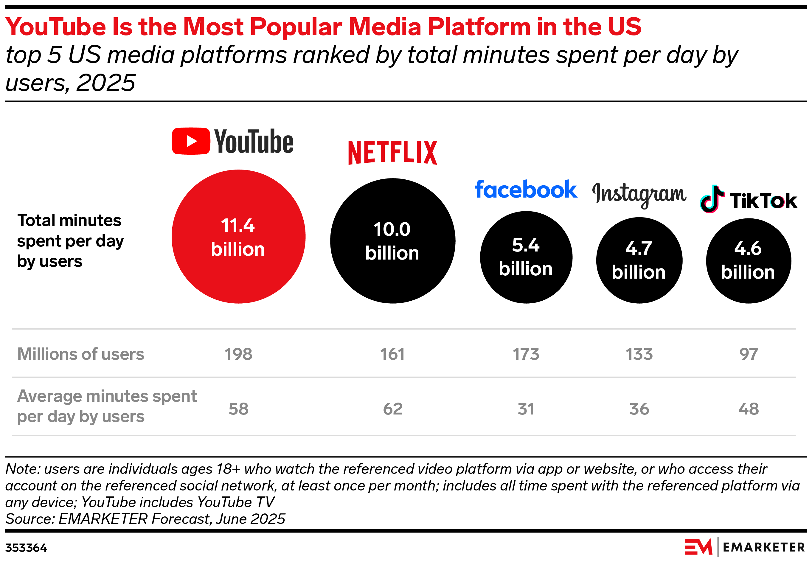 YouTube is the No. 1 US media platform when it comes to time spent by US adult users, reaching 11.4 billion minutes per day in 2025.